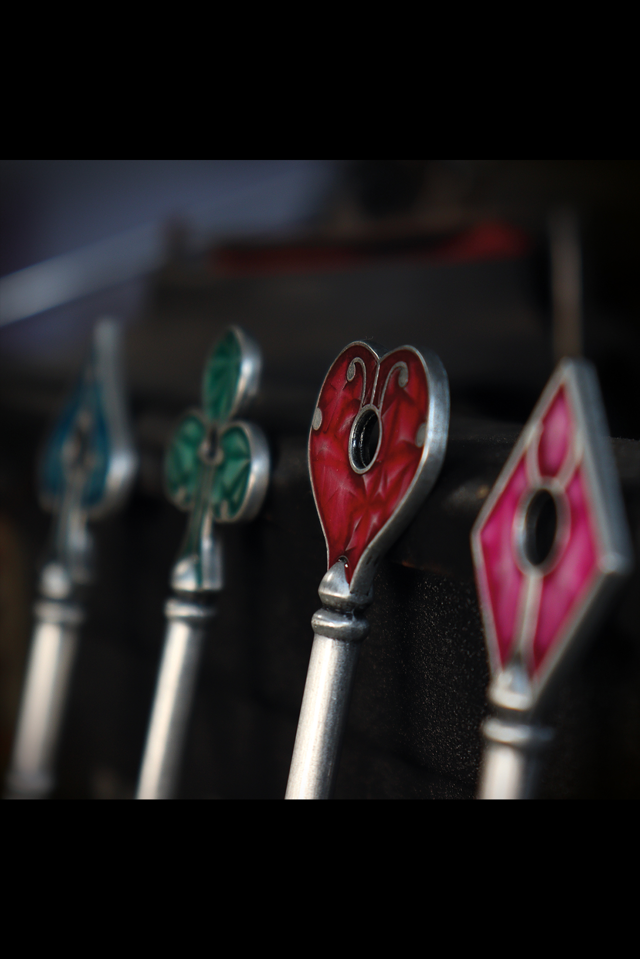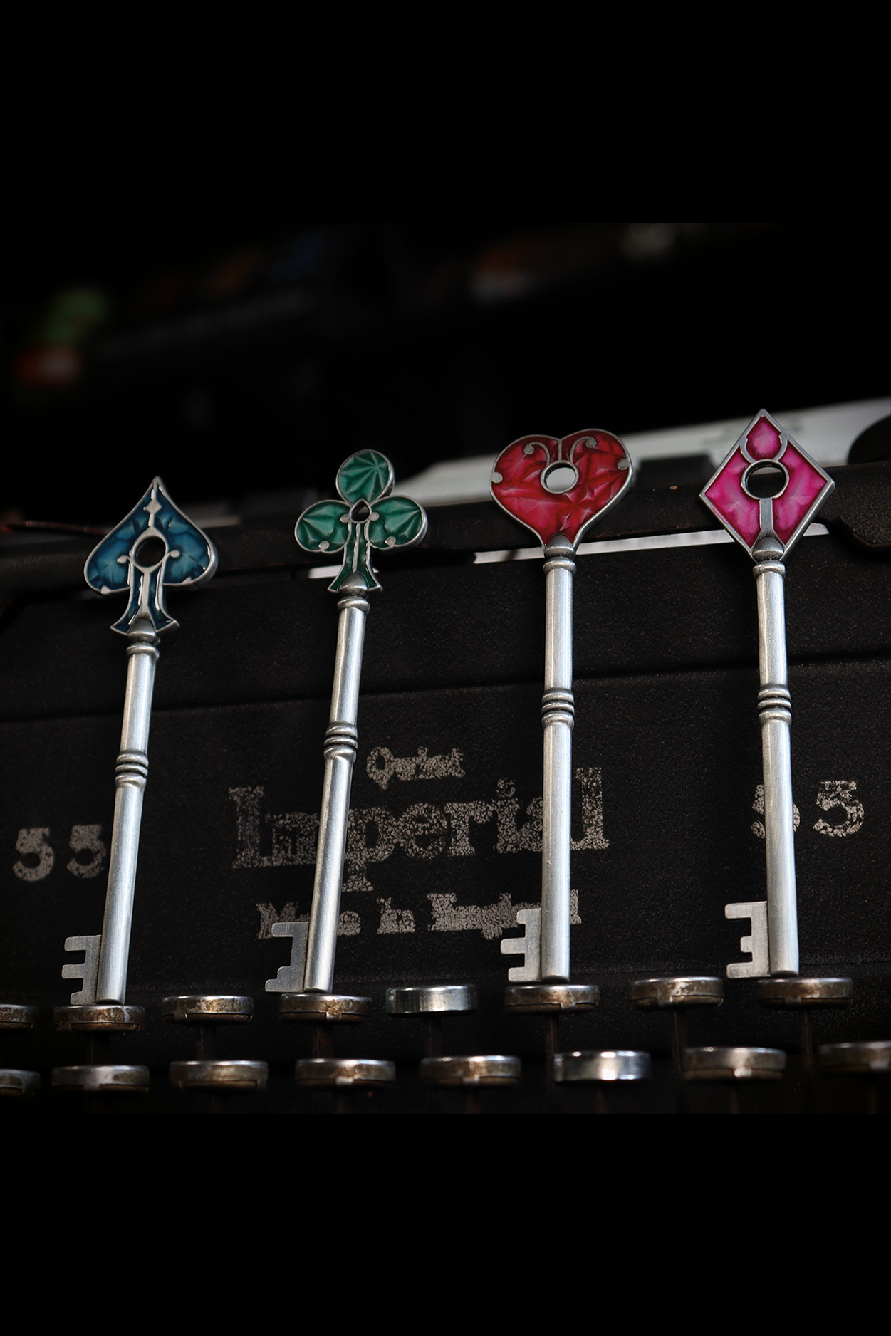 Each key stands at 100 mm tall and features intricately detailed enamel colouring on the head of the key creating a faithful recreation of the classic Heart, Diamond, Club, and Spade designs.
